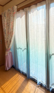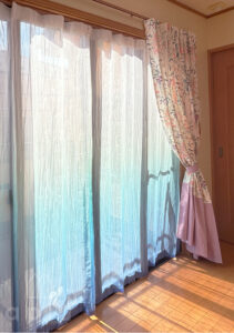 廊下の大きな掃き出し窓に、「リゾート風の雰囲気にしたい」というお施主様のご希望に沿って、軽やかで彩りのあるカーテンをコーディネートしました。