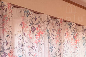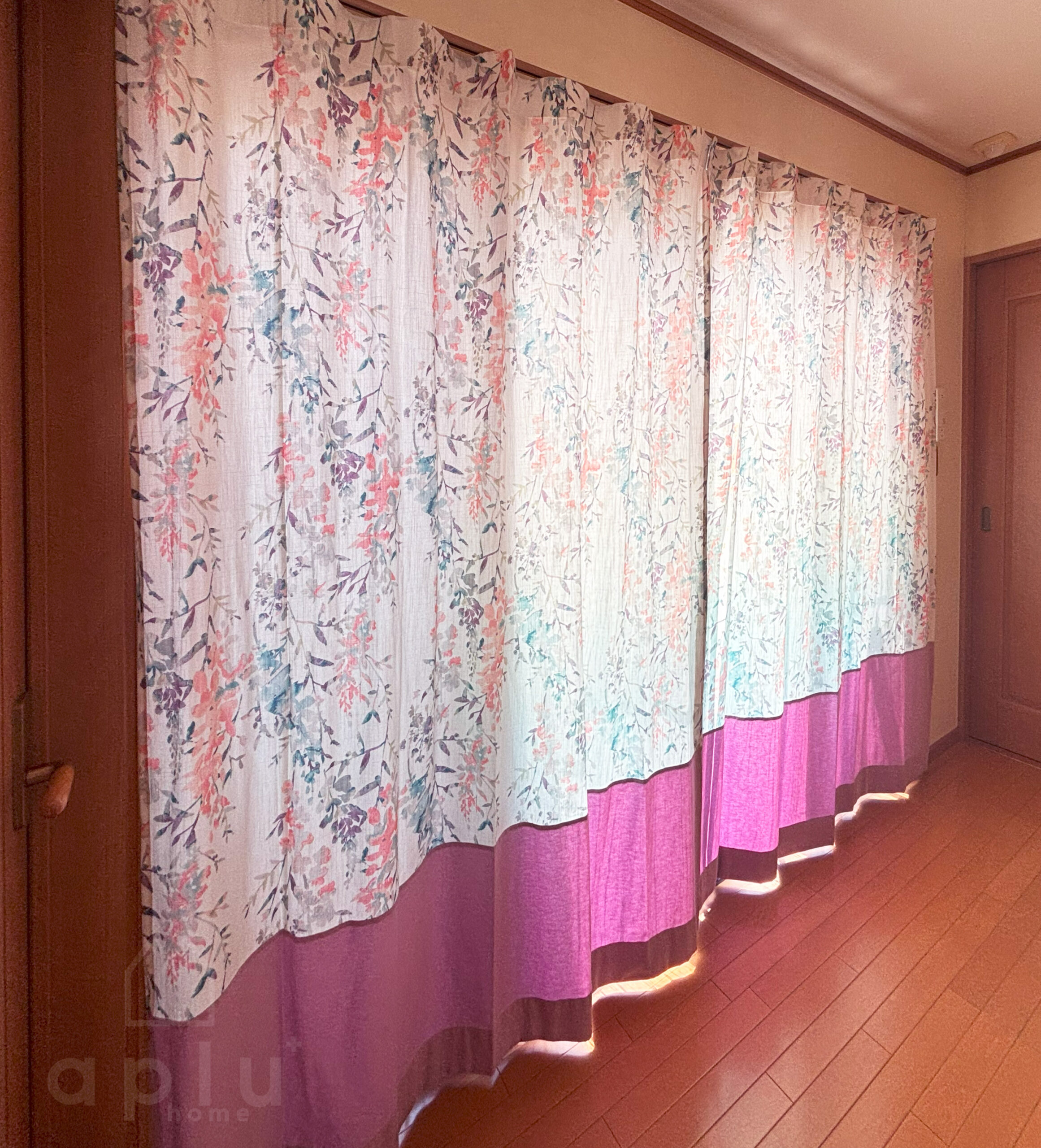 ドレープカーテンは、お客様とご相談のうえ、上部と裾で異なる生地を使ったオリジナルボーダー裾仕様に仕立てました。