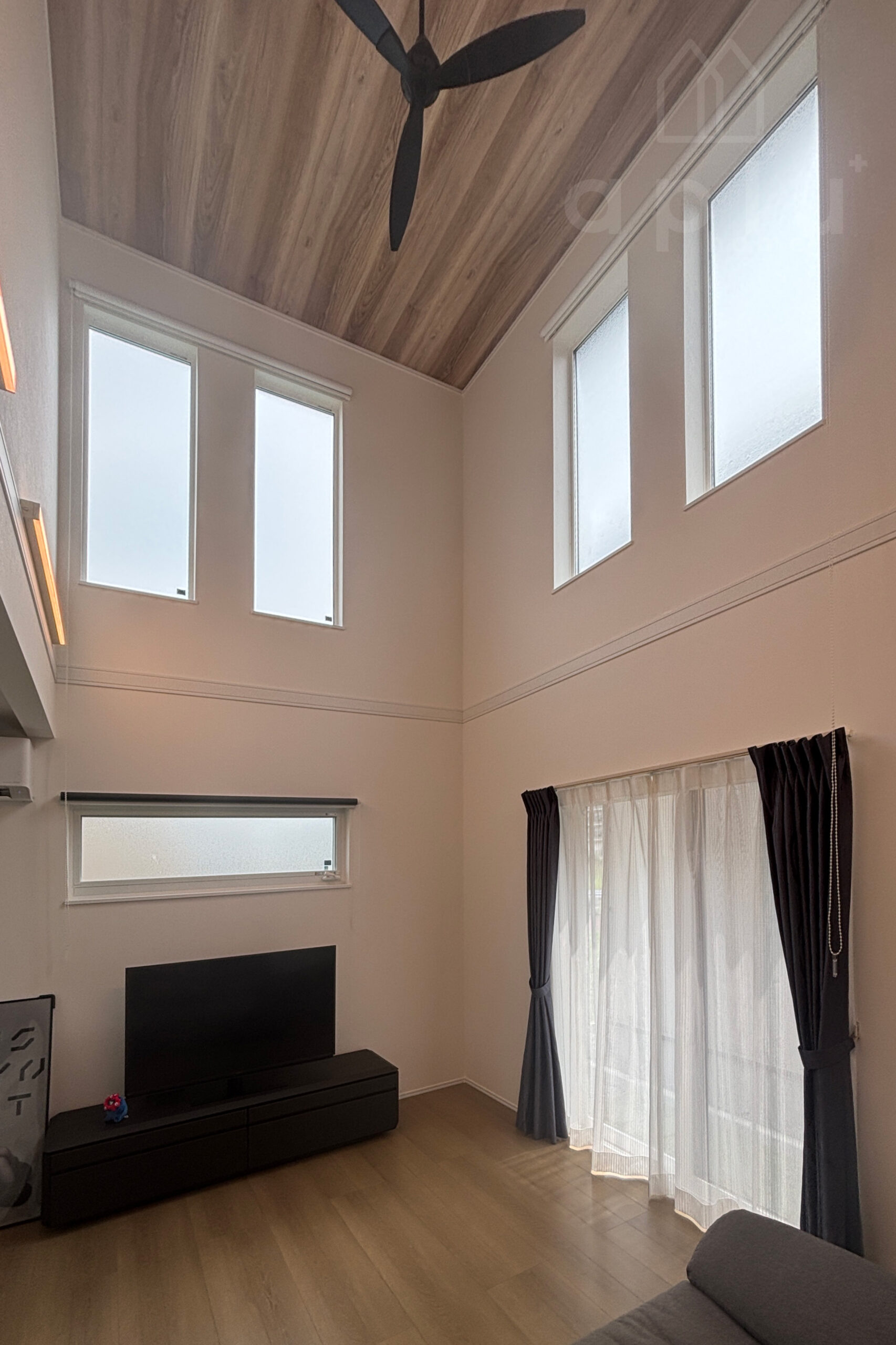 ■吹き抜け窓にロールスクリーンで快適なリビングに