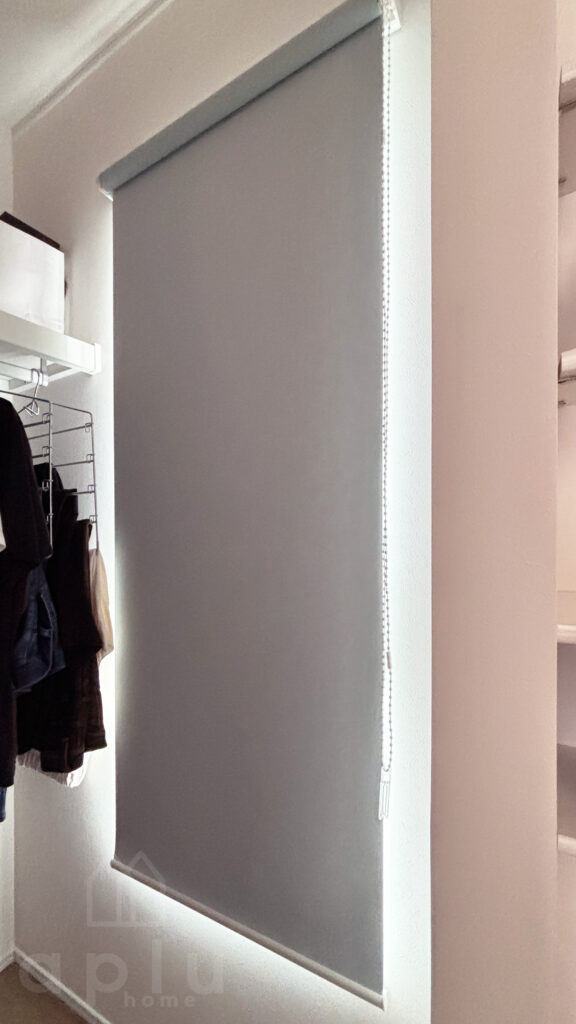寝室のウォークインクローゼットには、遮光1級の生地を使用したロールスクリーンを取り付けました。