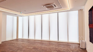 作品が主役であるギャラリーの雰囲気に調和するよう、生地や操作方法にもこだわってお選びいただきました。